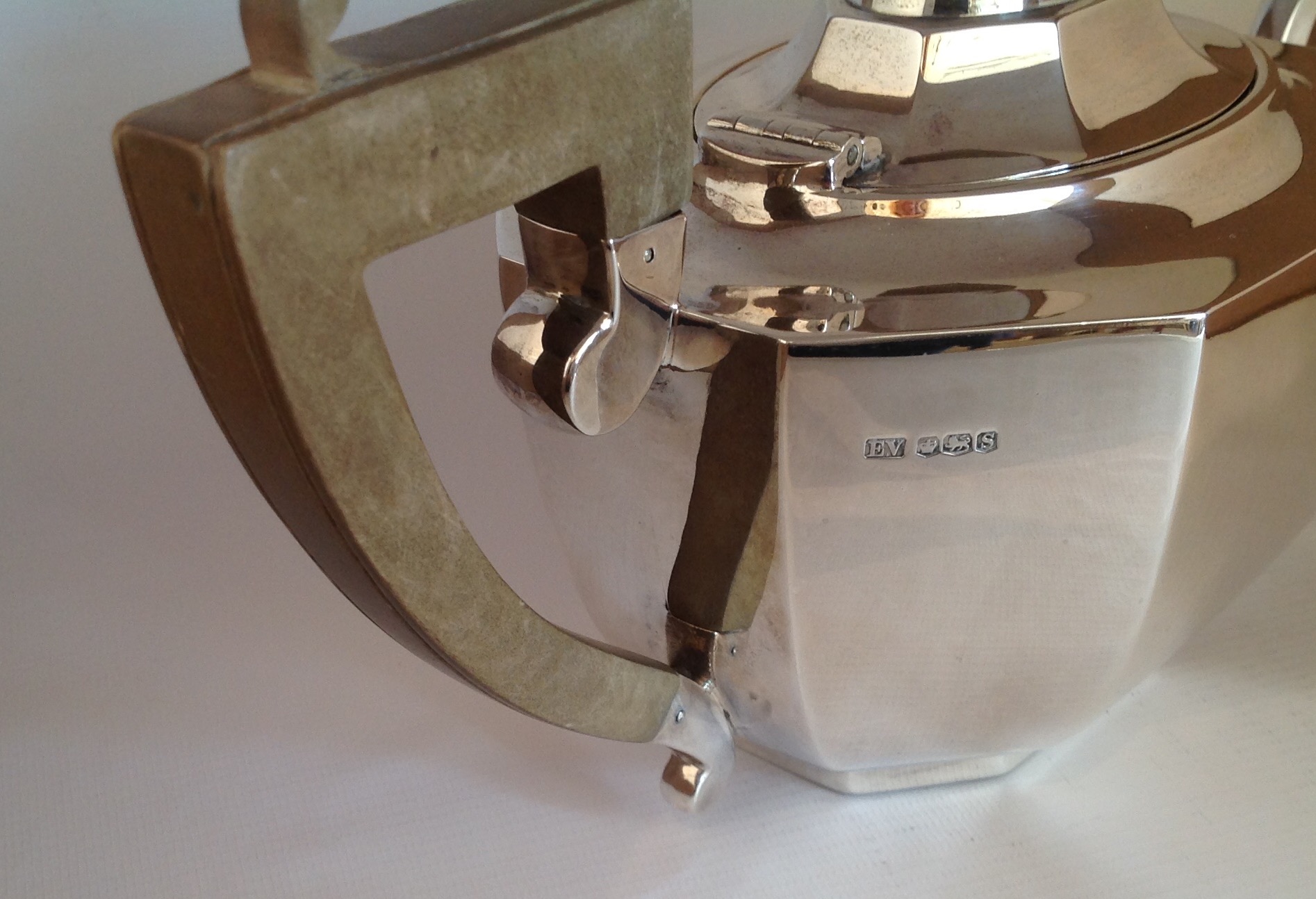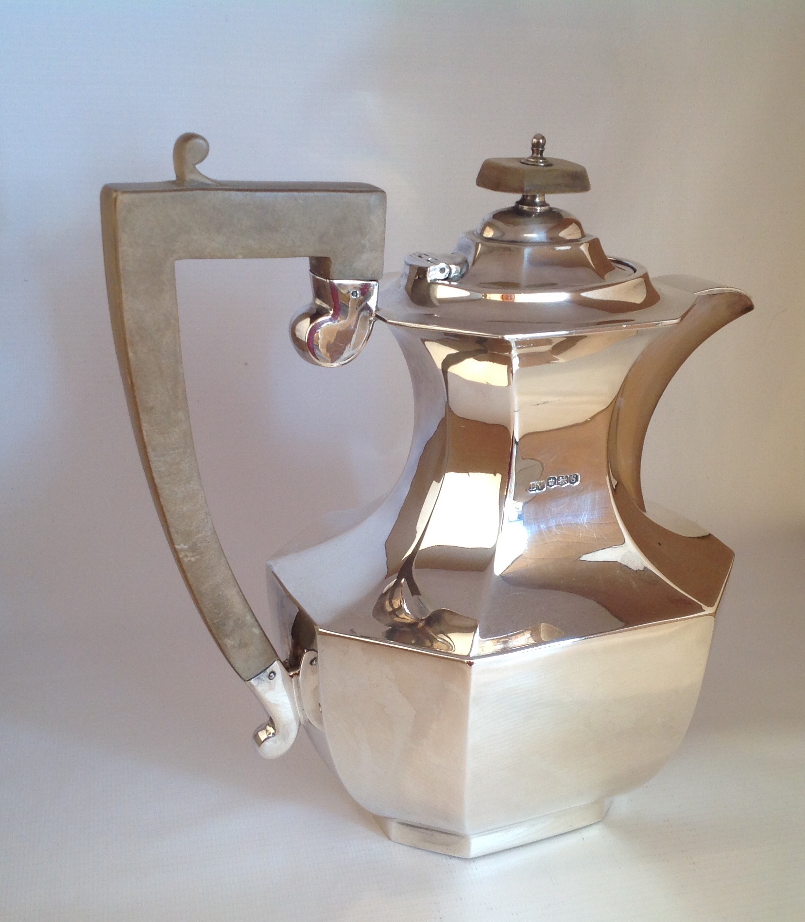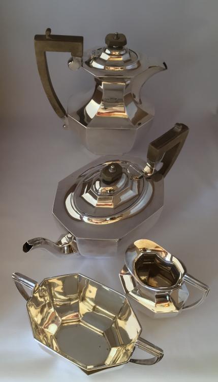 Art Deco sterling silver four piece tea set. Includes teapot, coffee pot, creamer and sugar basin. Hallmarked Eric Viner 1935 Birmingham.