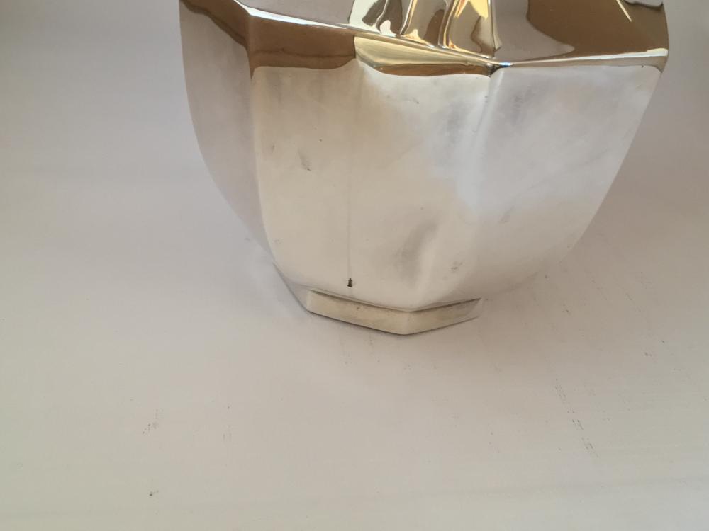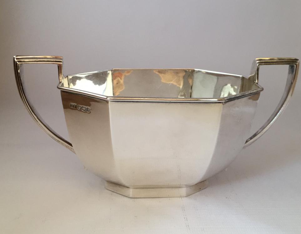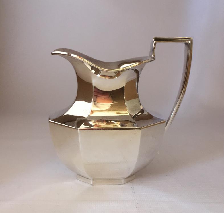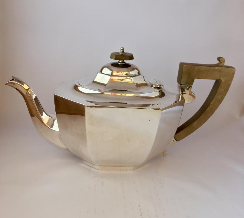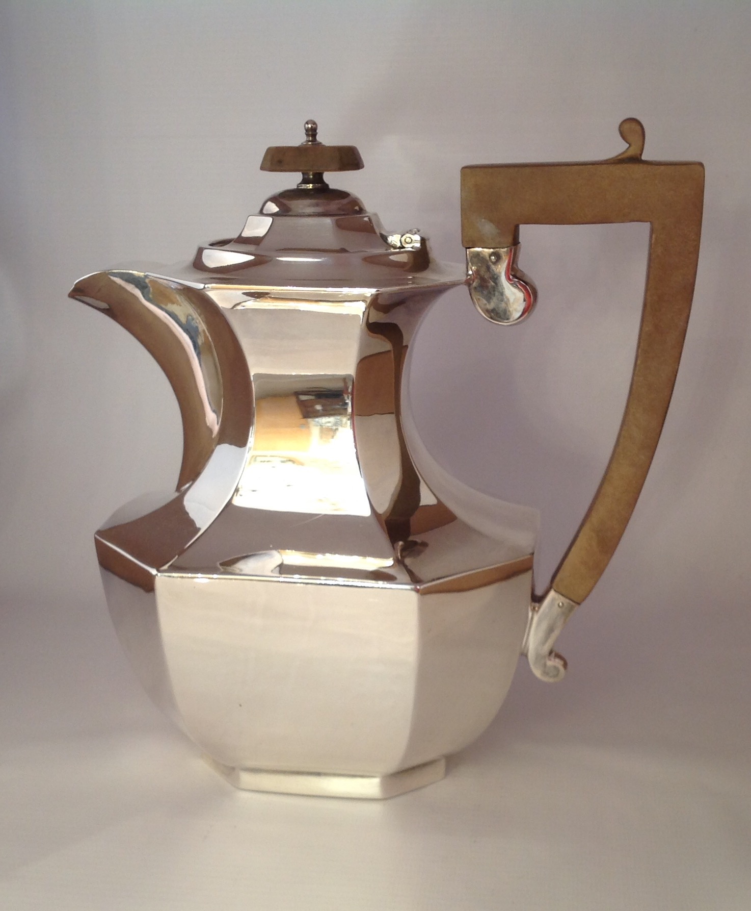 Art Deco sterling silver four piece tea set. Includes teapot, coffee pot, creamer and sugar basin. Hallmarked Eric Viner 1935 Birmingham.