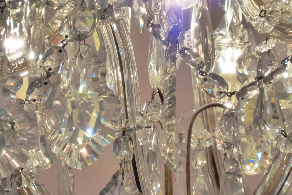 A very fine and early Maria Theresa Chandelier. The curved glass crystal slabs line the hand made brass frame, reflecting back the light giving this chandelier a light and airy feeling despite being festooned with hand cut glass crystal Pendalogues of exceptional quality, thick and weighty.