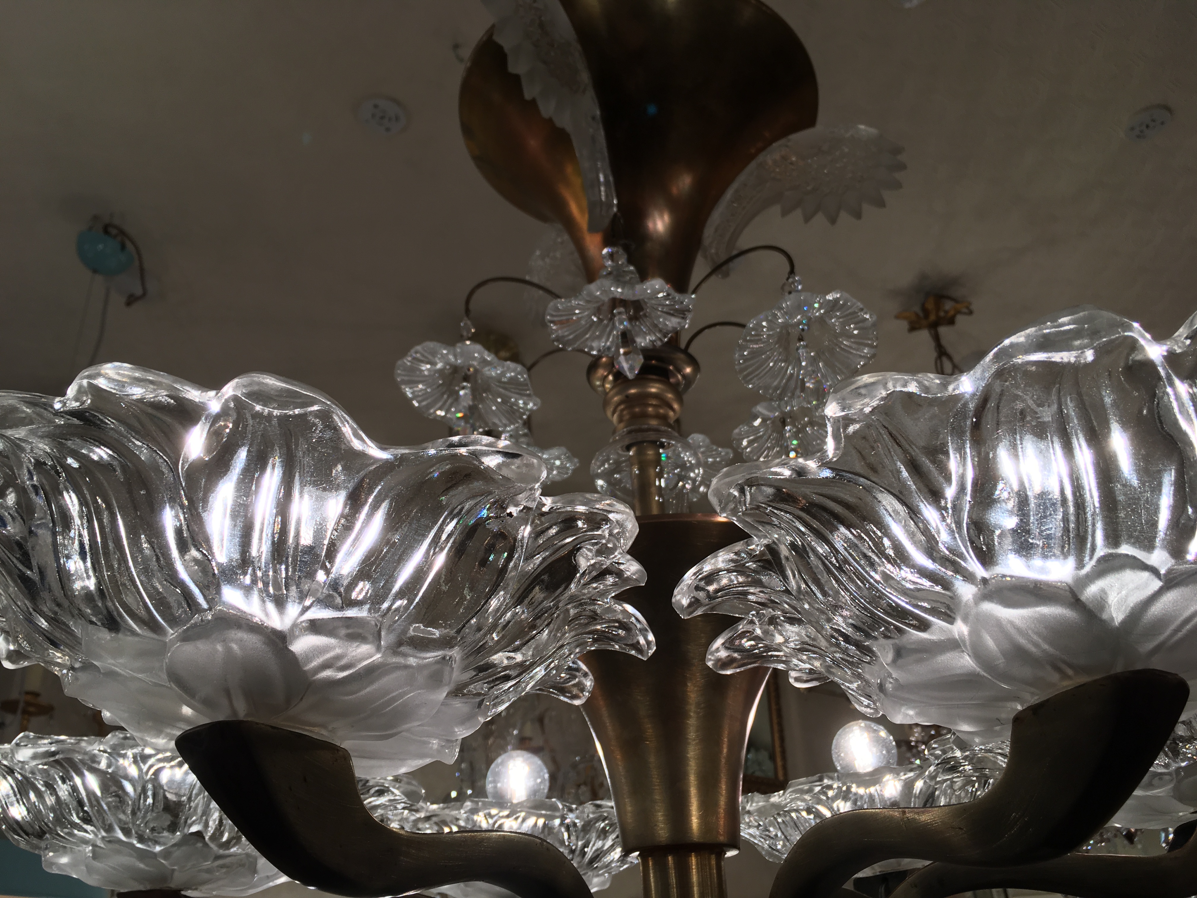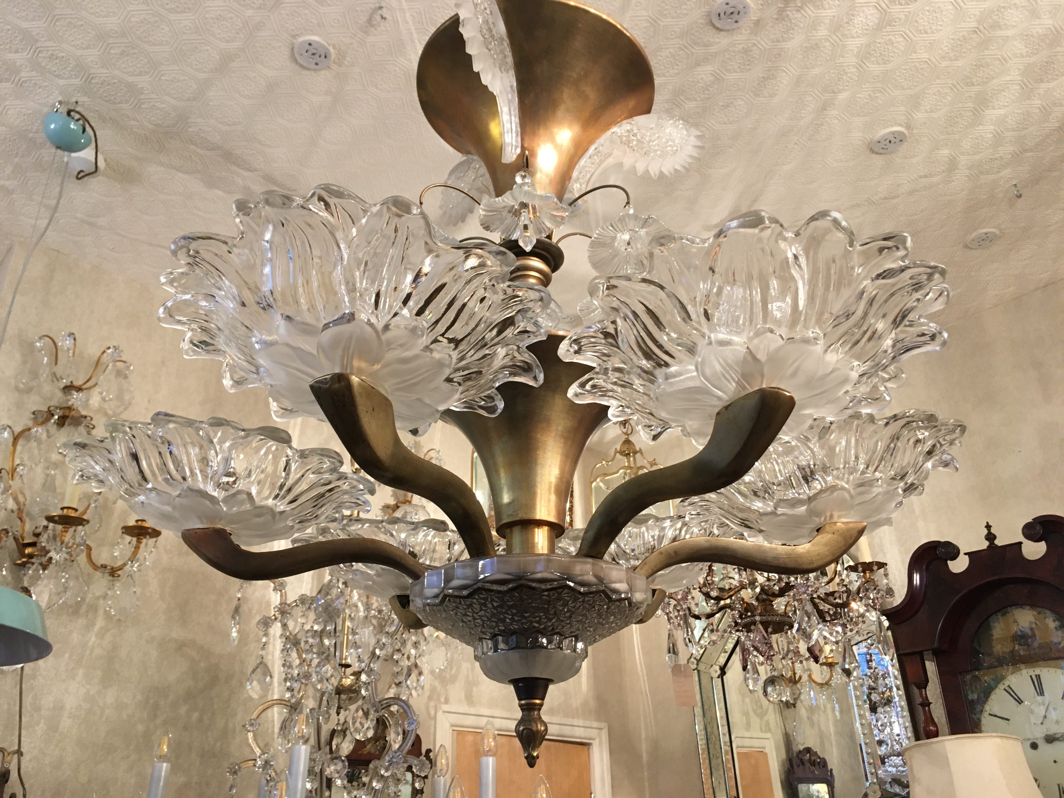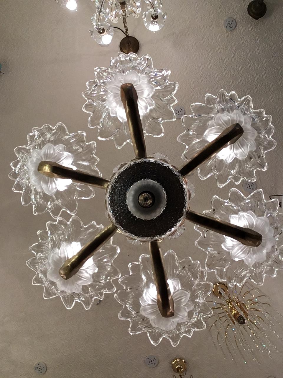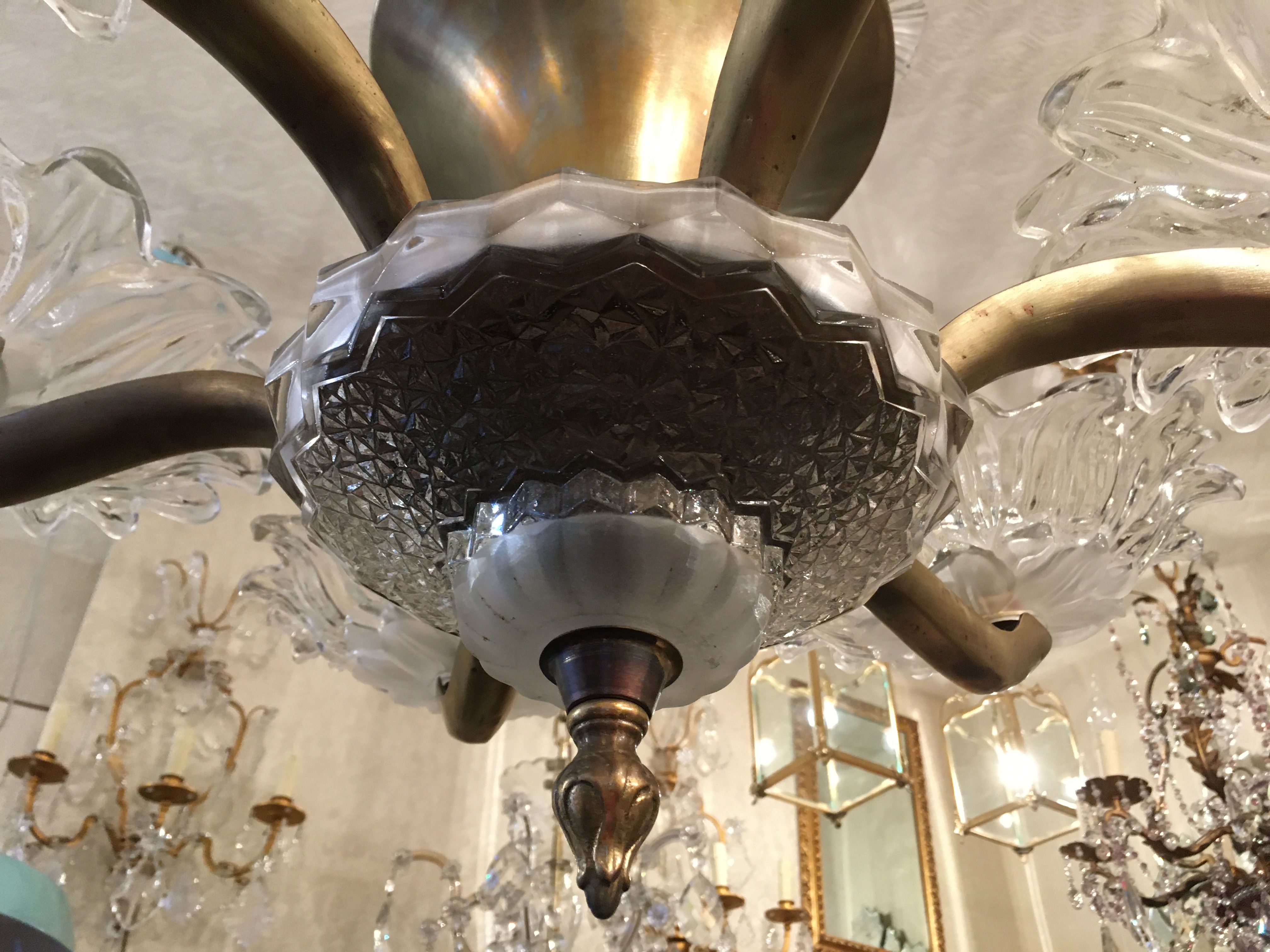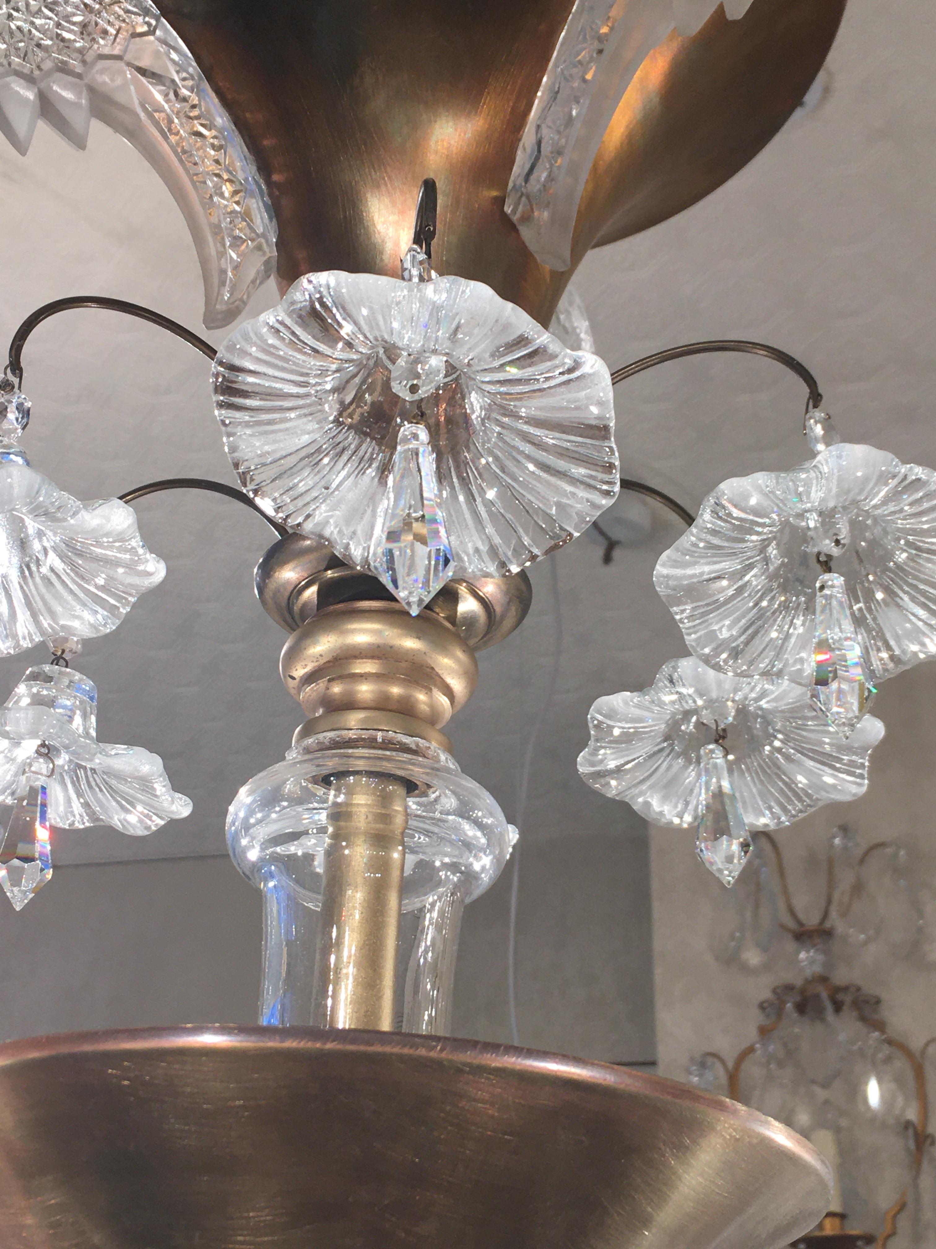Very decorative brass and and etched glass 6 branch ‘Paris Cafe’ chandelier from the 1930’s era.