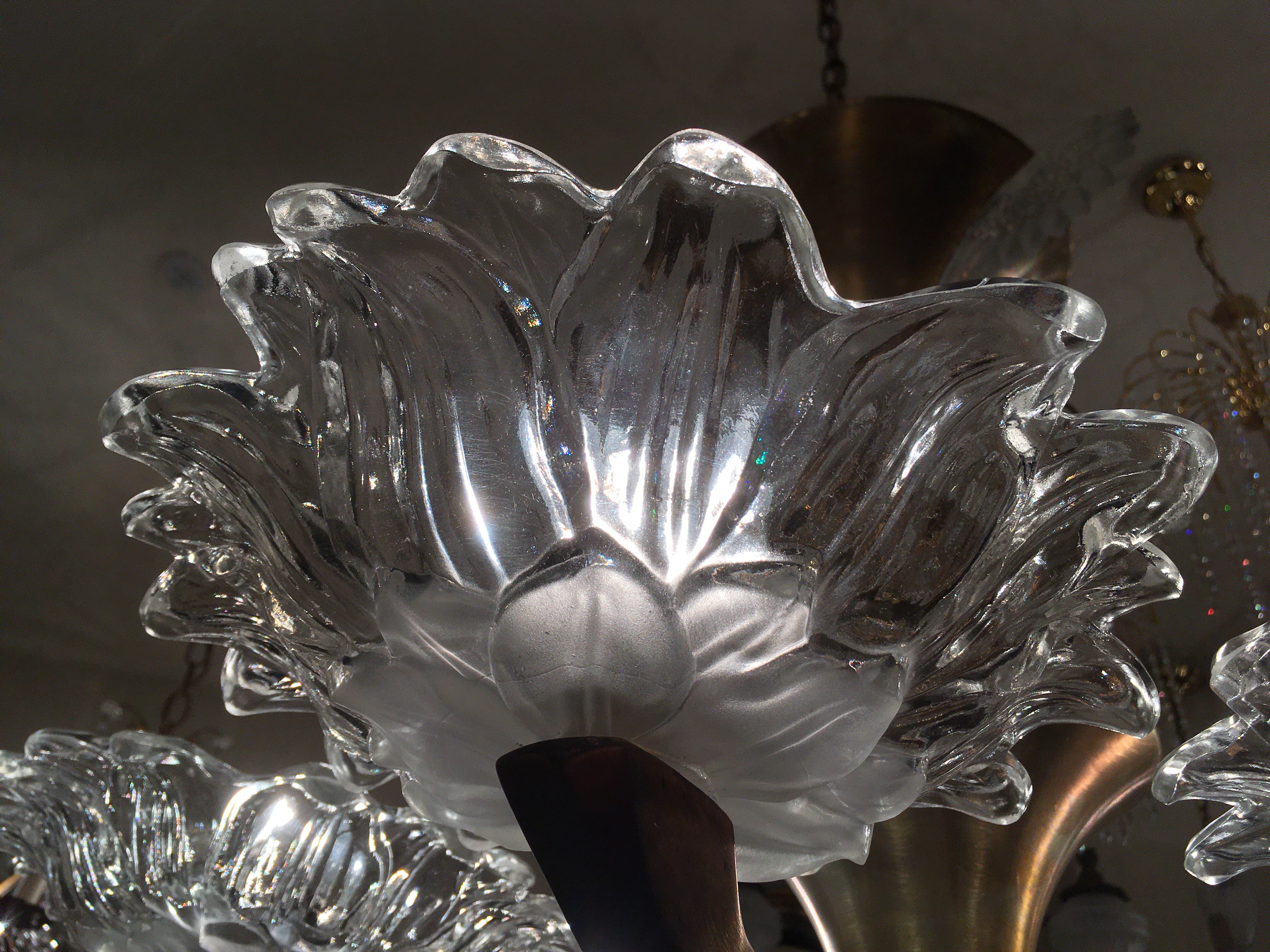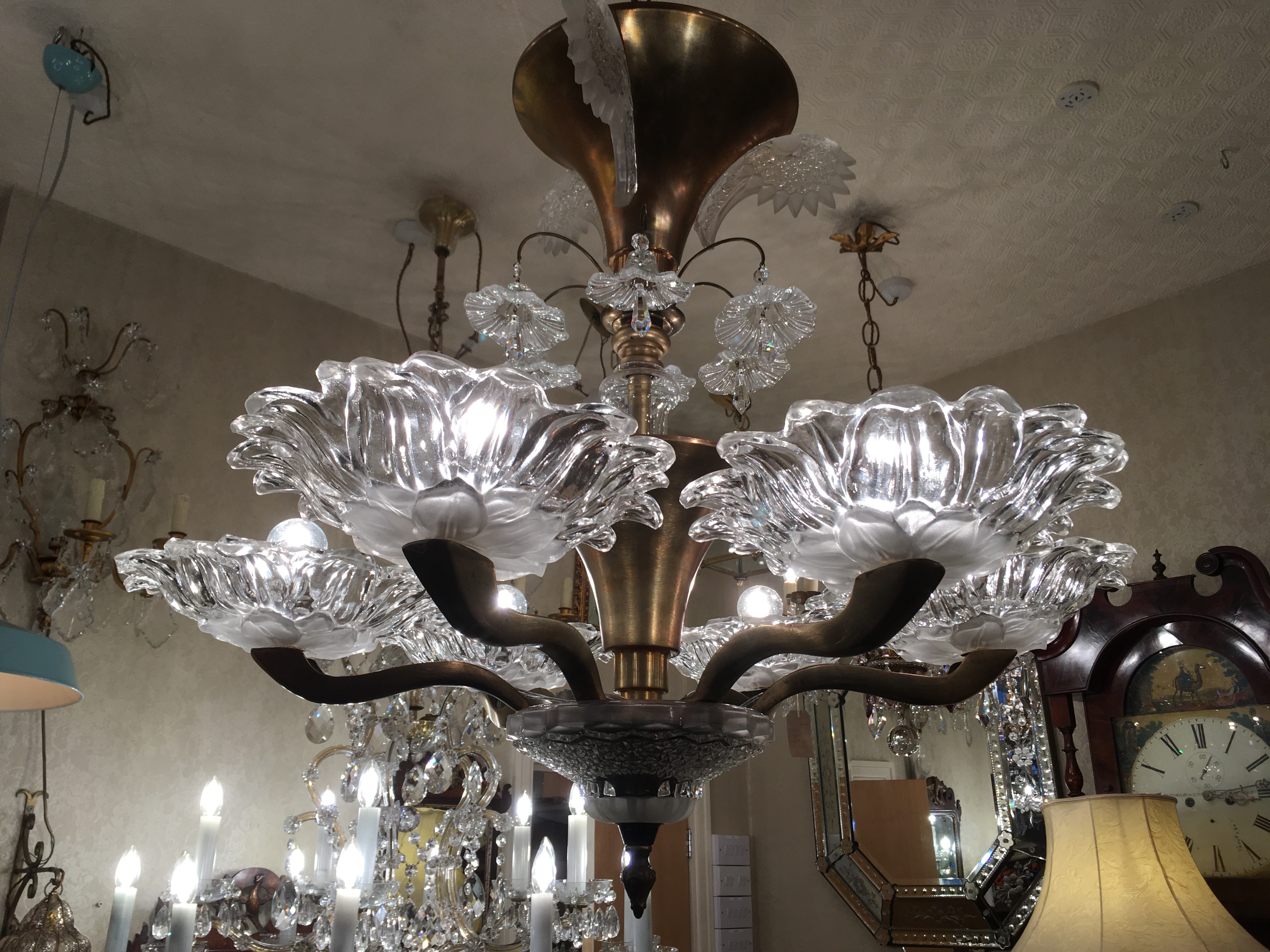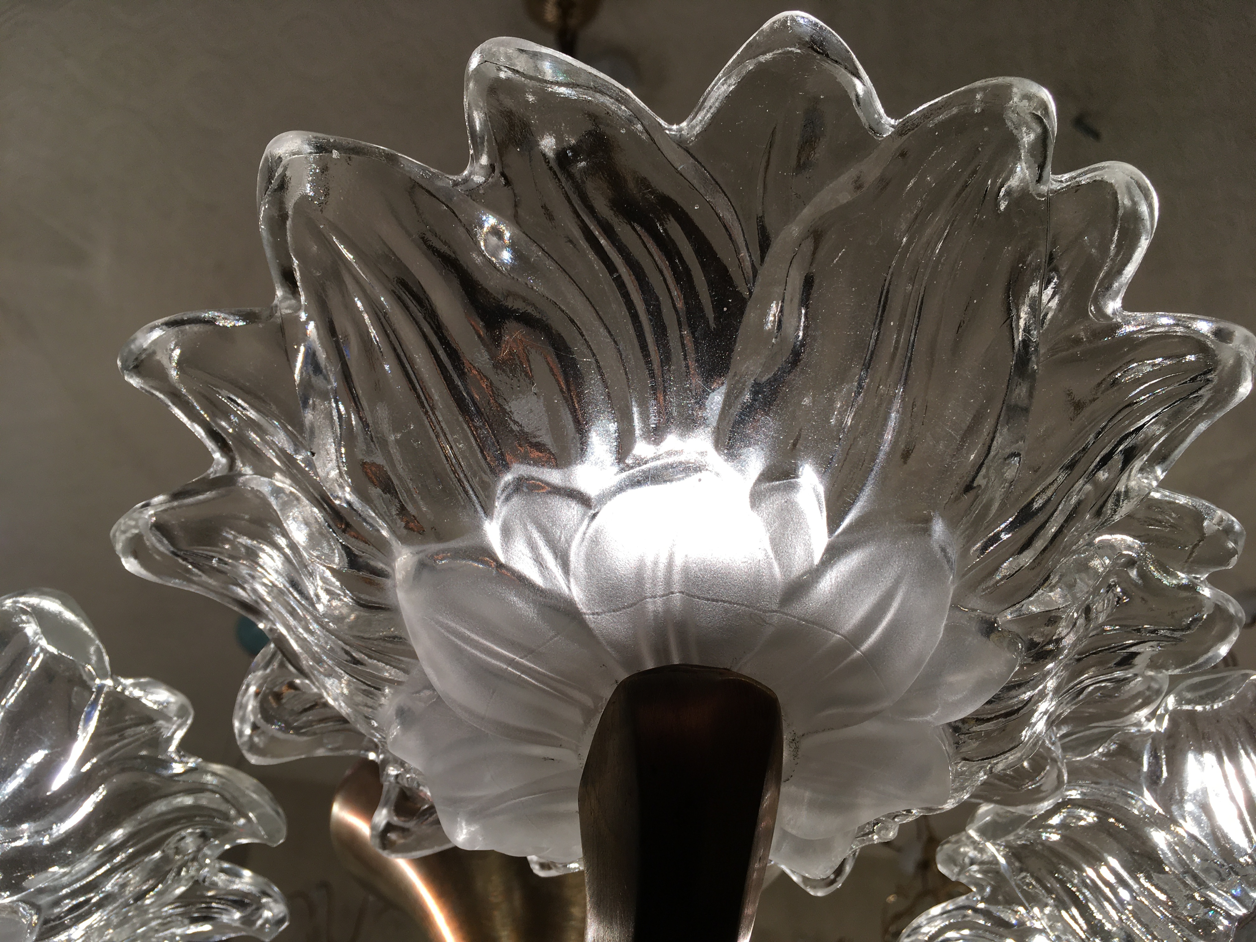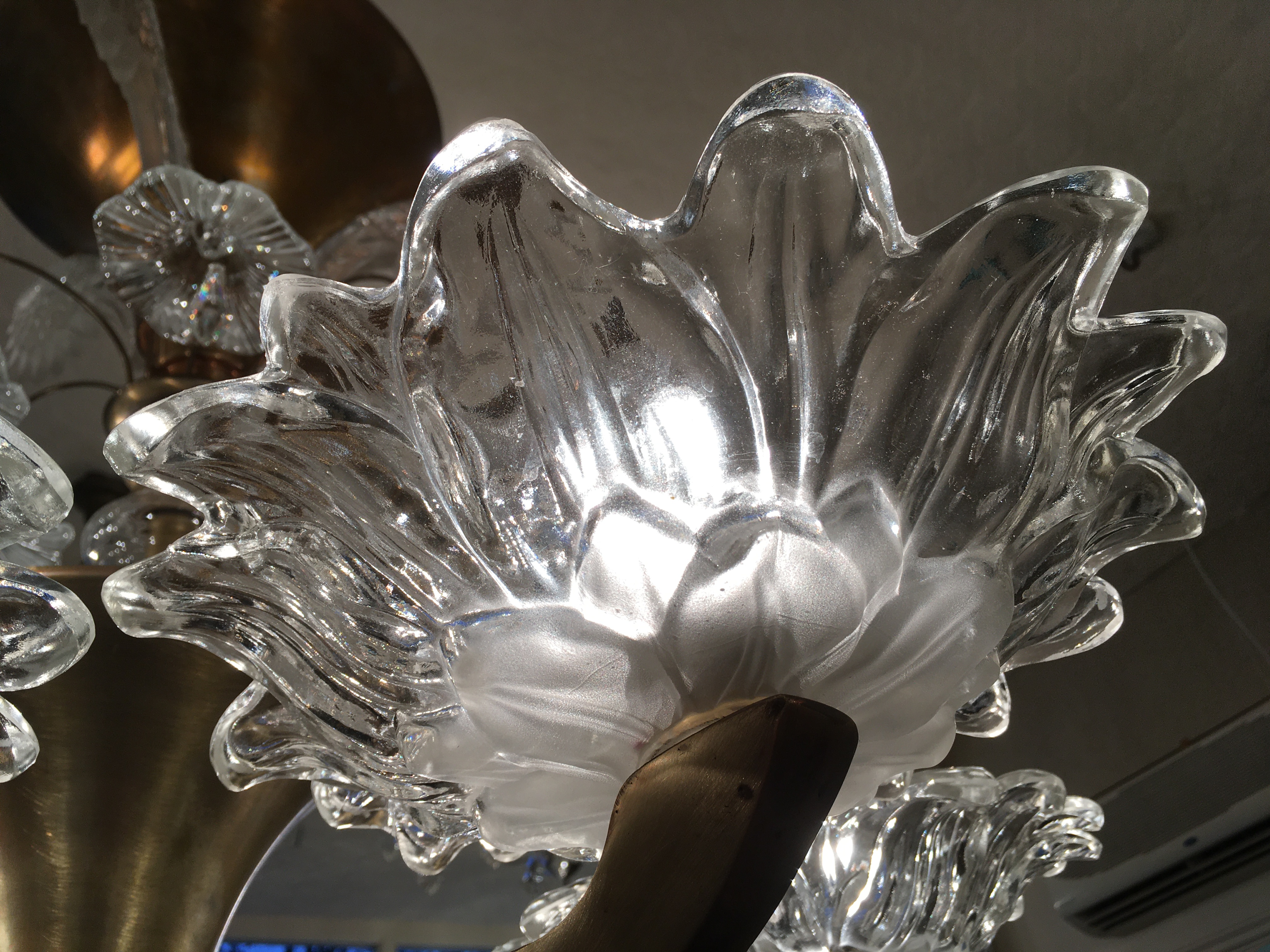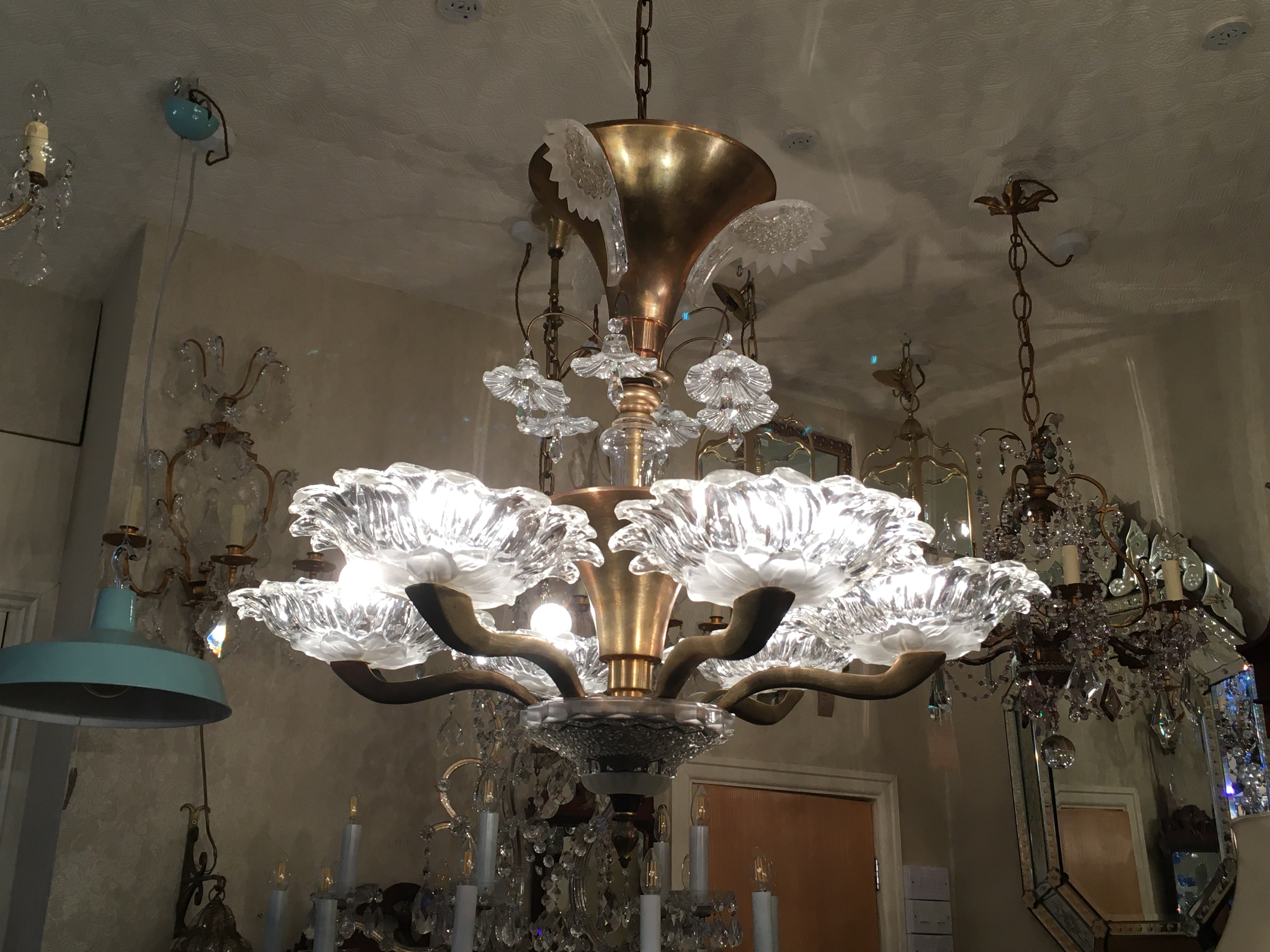 Very decorative brass and and etched glass 6 branch ‘Paris Cafe’ chandelier from the 1930’s era.