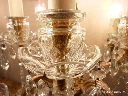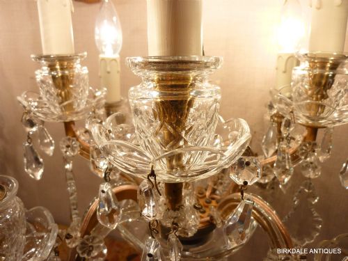 The central column terminating in crystal eprernes, surmounted by 10 sold brass branches with crystal babeches and new candle light holders.